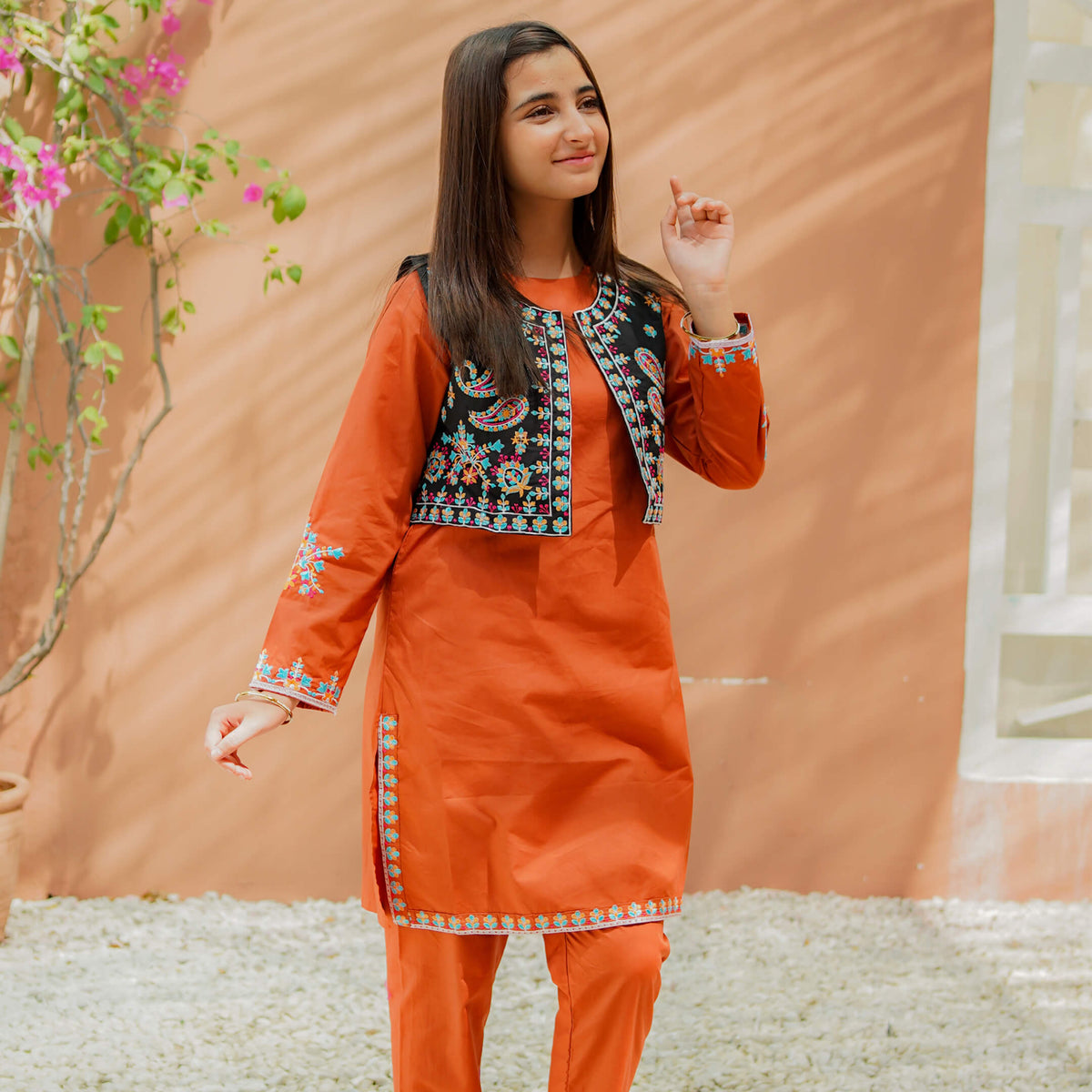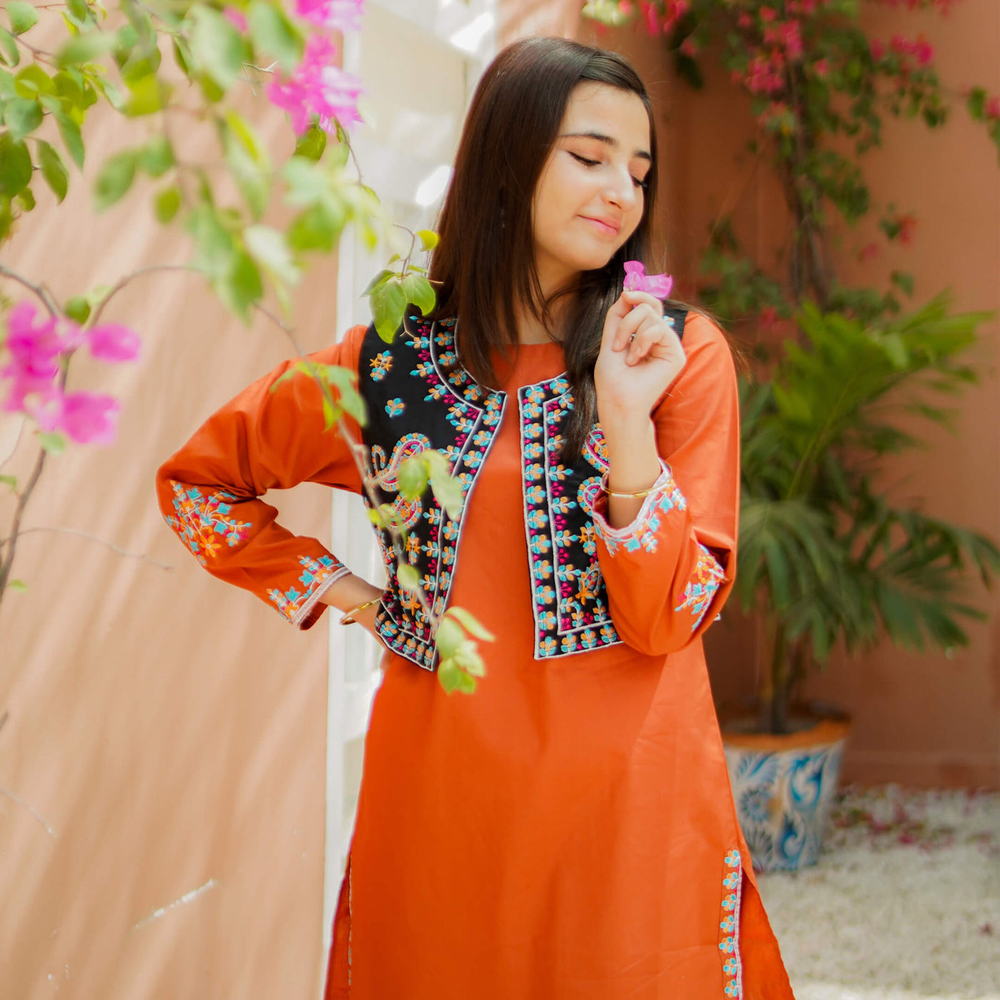 Paired with a black embroidered waistcoat, giving it a trendy and cultural fusion look.