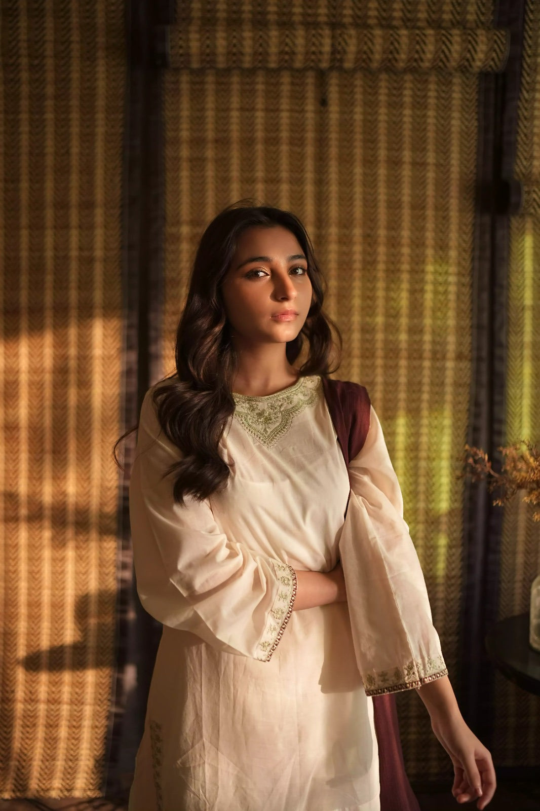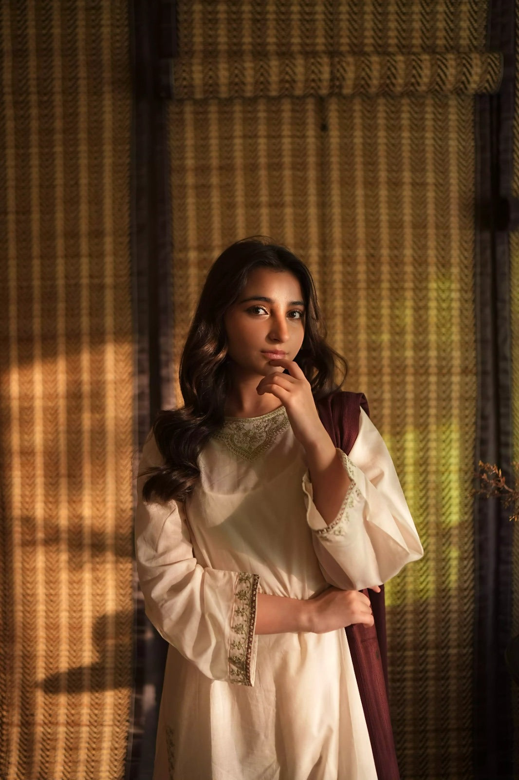 The Dupatta: A contrasting dupatta in a deep jewel tone (maroon/magenta) to break the monochrome and add a soft, feminine touch.