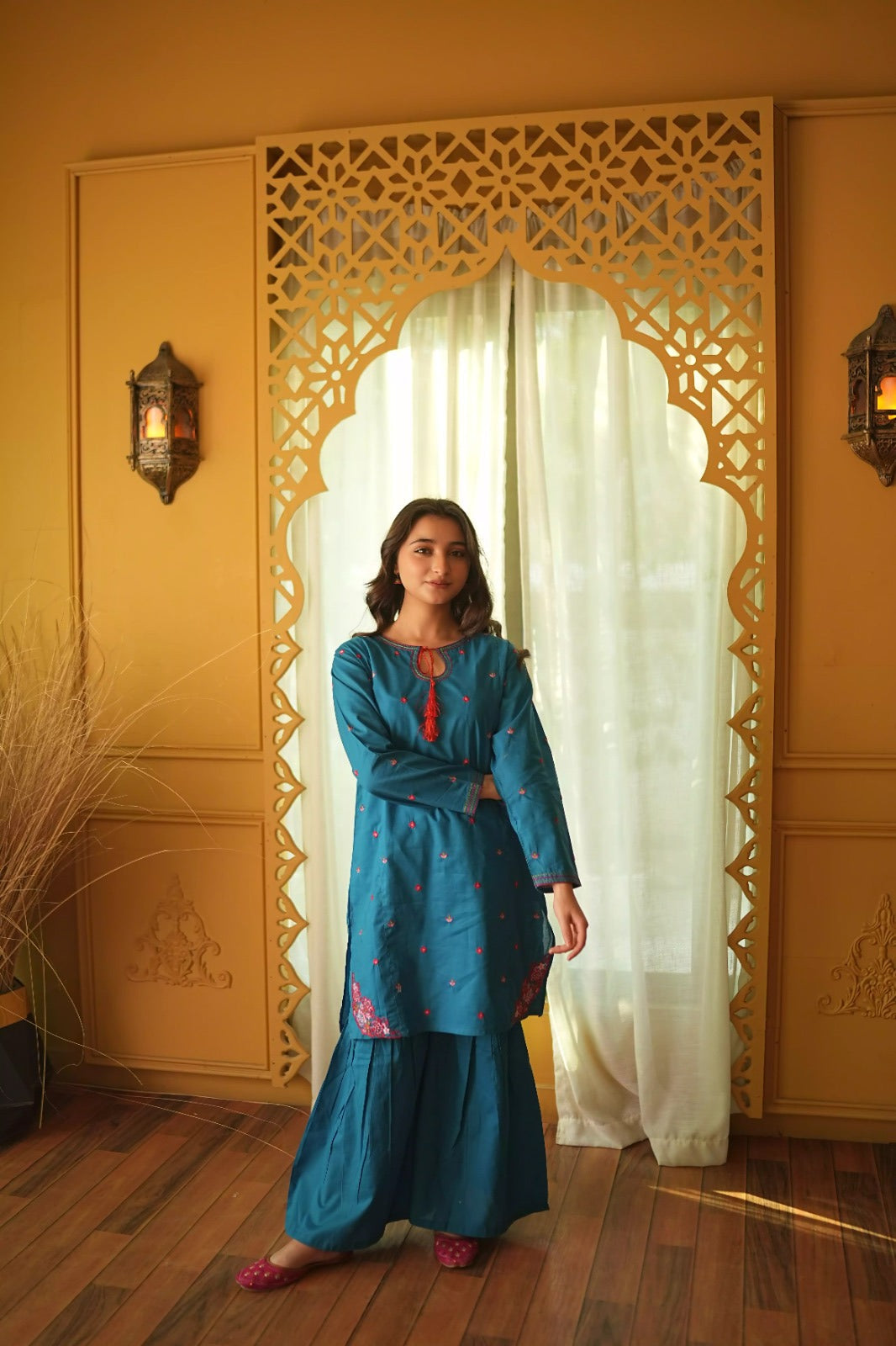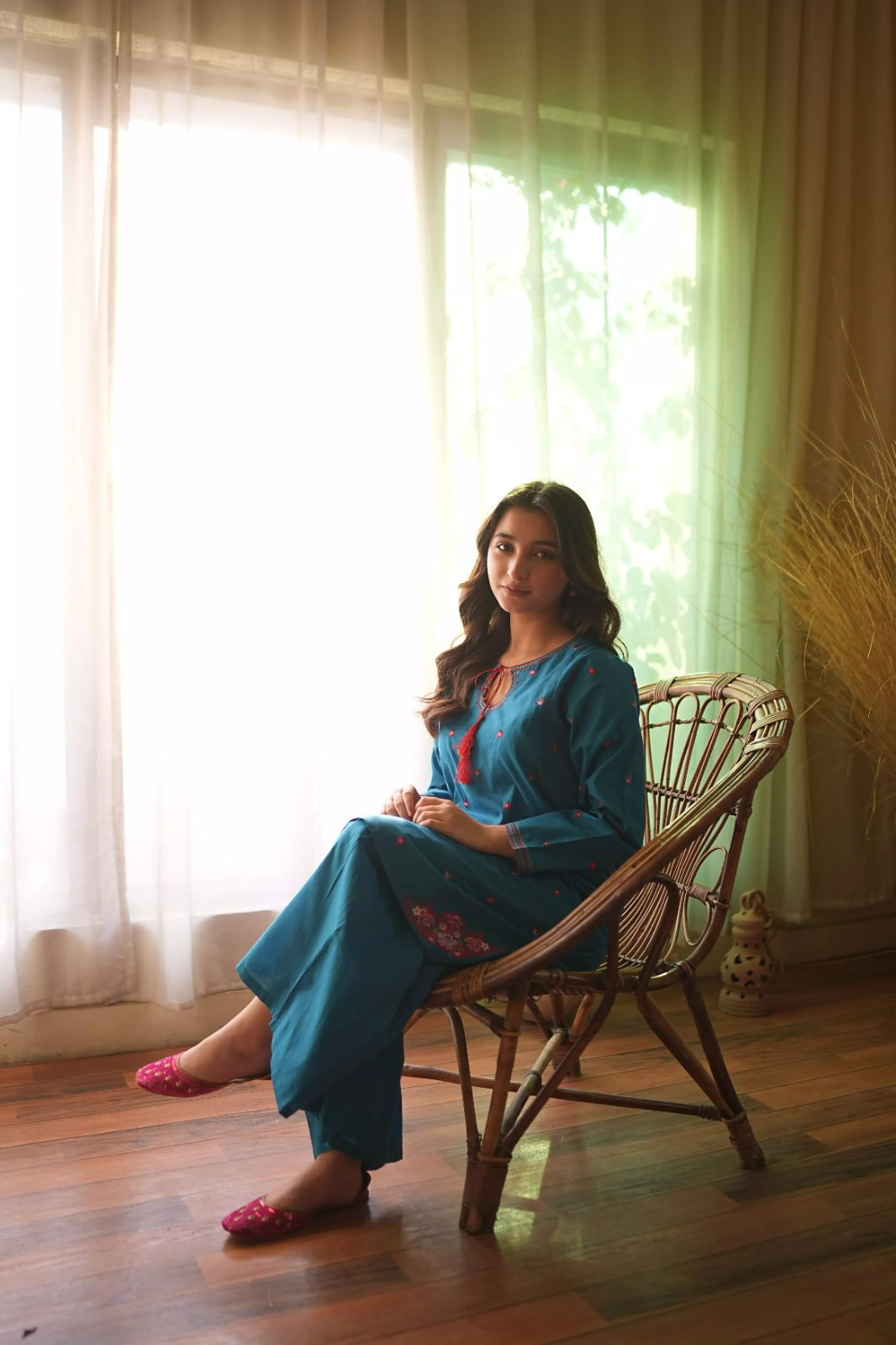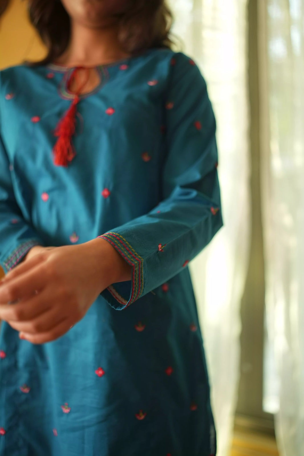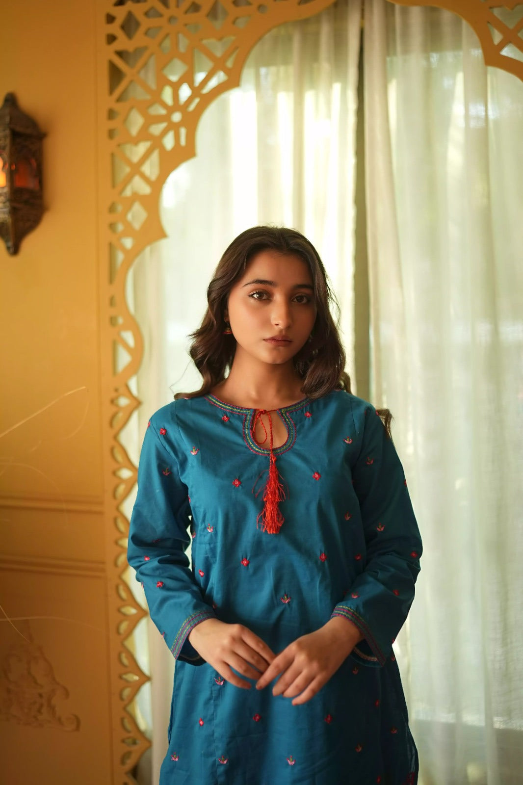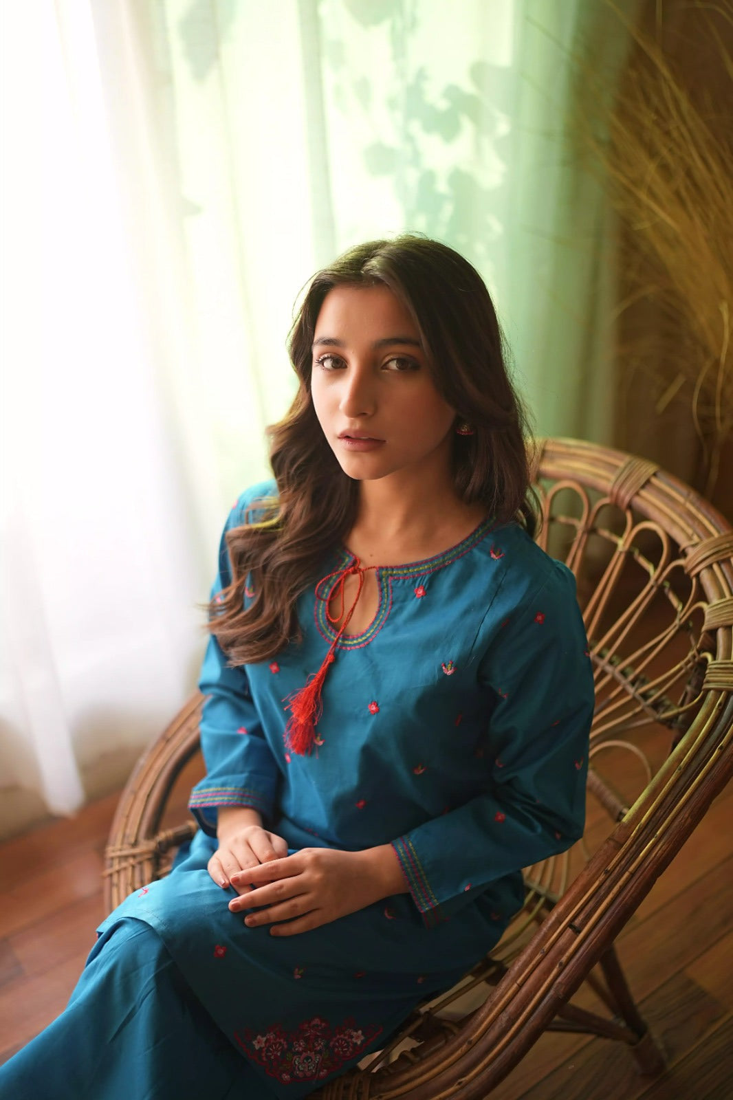 • The Shirt: A rich teal tunic featuring delicate red floral embroidery scattered across the front. The neckline is highlighted with a unique keyhole design and a vibrant red tassel accent.