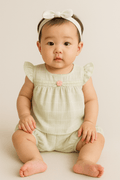 Light green with white checkered pattern, flutter sleeves, and a cute pink bow for a sweet look. -